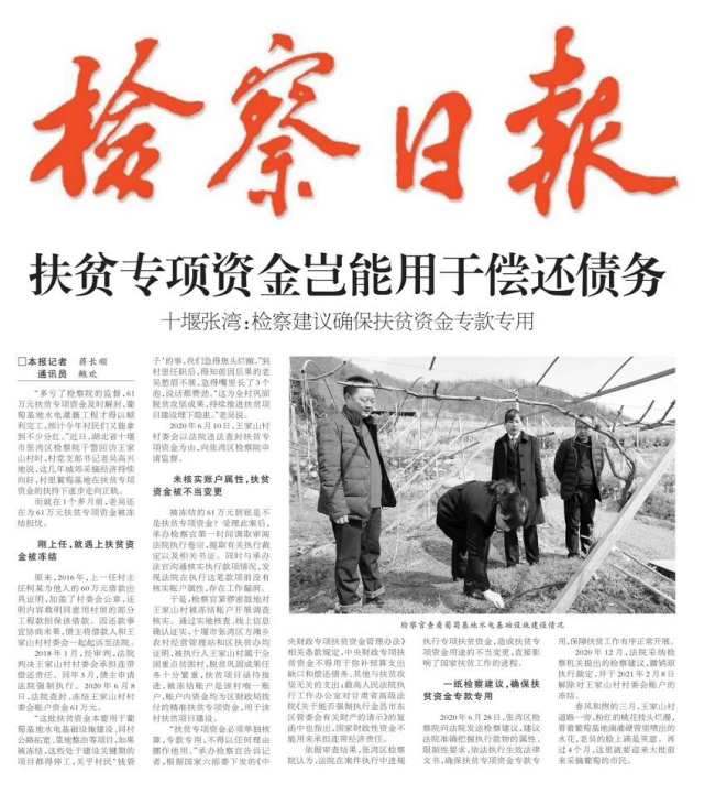 2020年6月28日,张湾区检察院向法院发送检察建议,建议法院准确把握执行款物的属性、限制性要求,依法执行生效法律文书,确保扶贫专项资金专款专用,保障扶贫工作有序正常开展。